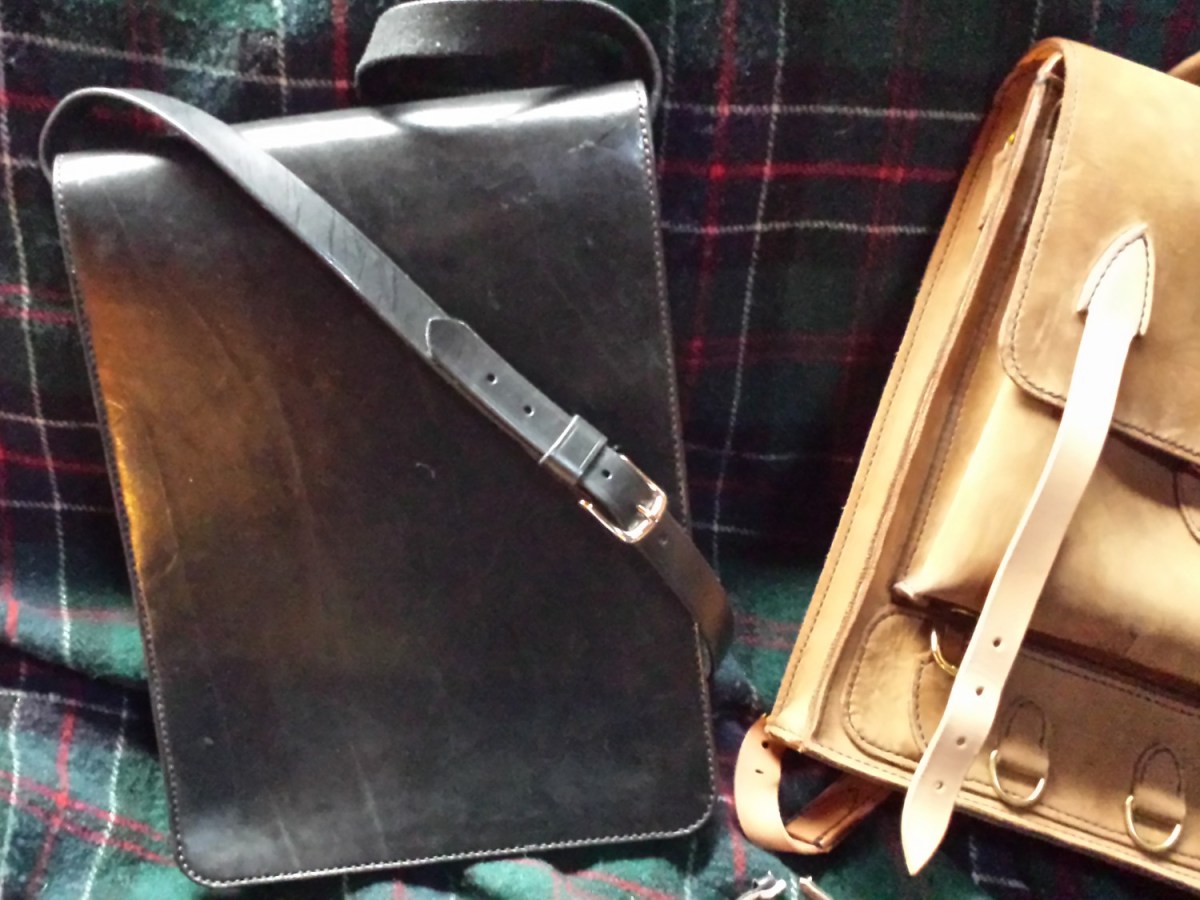 A sabretache was a flat bag that hung next to the light cavalry trooper’s sword. It was use to carry orders across a battlefield. Roman legionaries carried a “loculus,” a kind of cross-body haversack. Today, we carry bags of similar design to carry computers, tablets, books, papers, phones, and any number of things. I prefer to use hand dyed veg tanned leather, hand stitched, and solid brass hardware.
